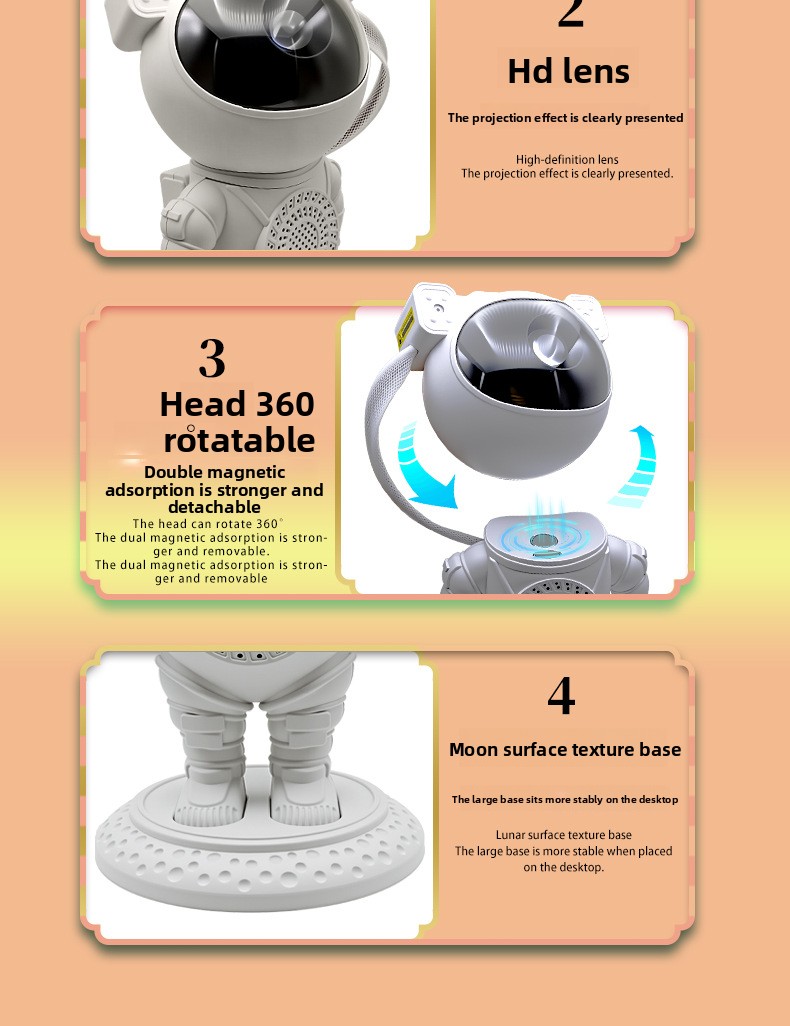 360� Magnetic Versatility: The astronaut?s head is magnetically attached, allowing you to project the cosmos at any angle?on the ceiling, walls, or floor.